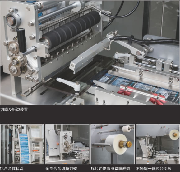 1.本機是一款全自動高速透明膜包裝設備,采用平推式包裝方式,所有裹包及熱封動作均凸輪傳動完成,具有速度快、運行穩定等特點。