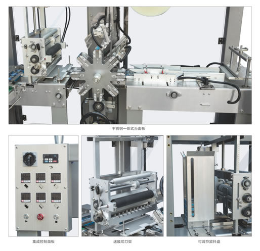 本机适用于各行业中的单件盒式物品的薄膜自动包装(带金拉线)。本机整体机架采用碳钢喷塑、落地多开安全门结构,采用平推式推盒结构,更换模具简单,调节距离多处采用手摇式调节尺寸,大大节省换模具时间,固定膜处采用气涨轴辊固定,使换膜更简单、快速。
