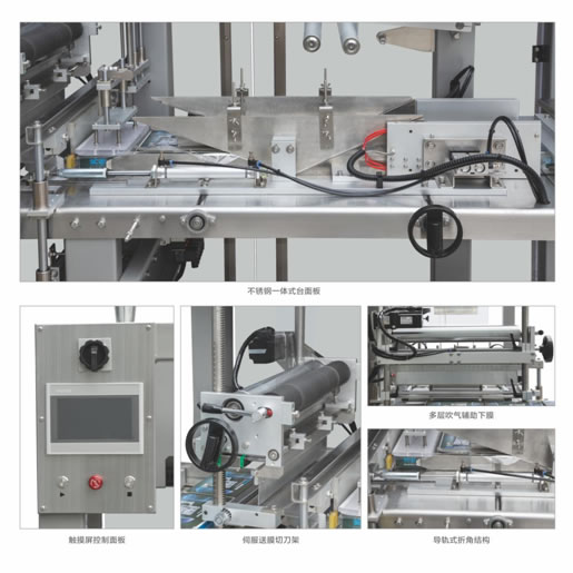 該機(jī)廣泛適用于藥品、保健品、食品、化妝品、文具用品、音像制品等行業(yè)中的各種單件大盒物品包裝或多件小盒物品的集合薄膜包裝(帶金拉線)。